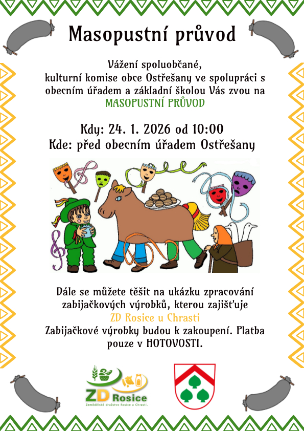 Kulturní komise obce Ostřešany ve spolupráci s obecním úřadem a základní školou srdečně zve všechny občany na masopustní průvod, který se uskuteční 24. ledna 2026 od 10:00 hodin před obecním úřadem. V rámci akce si budete moci prohlédnout ukázku zpracování zabijačkových výrobků, kterou připraví ZD Rosice u Chrasti. Tyto výrobky budou také k zakoupení, platby jsou možné pouze v hotovosti. Masky vítány!
